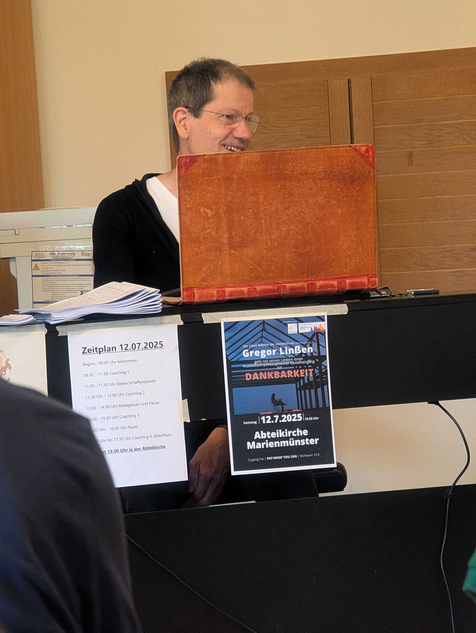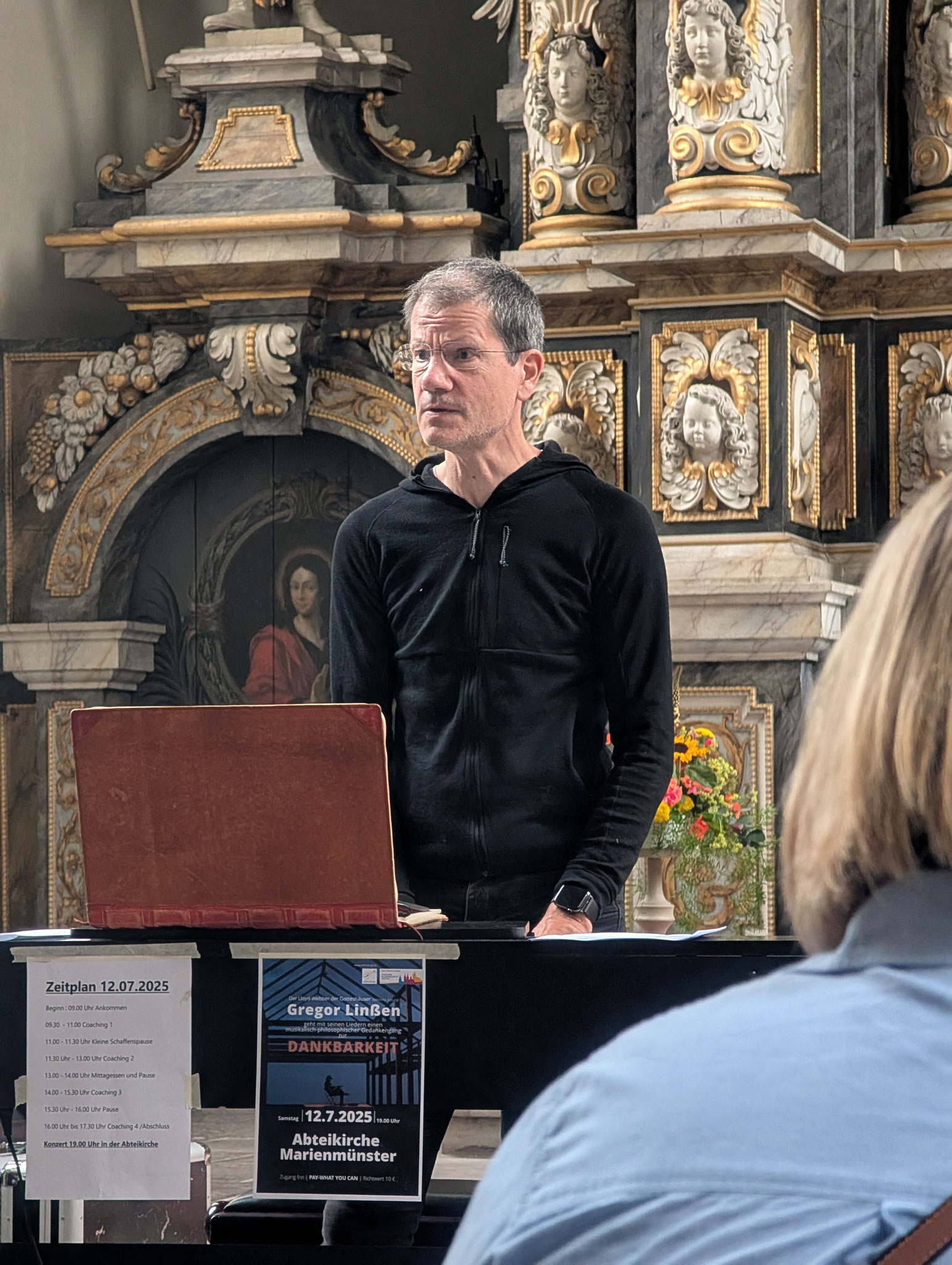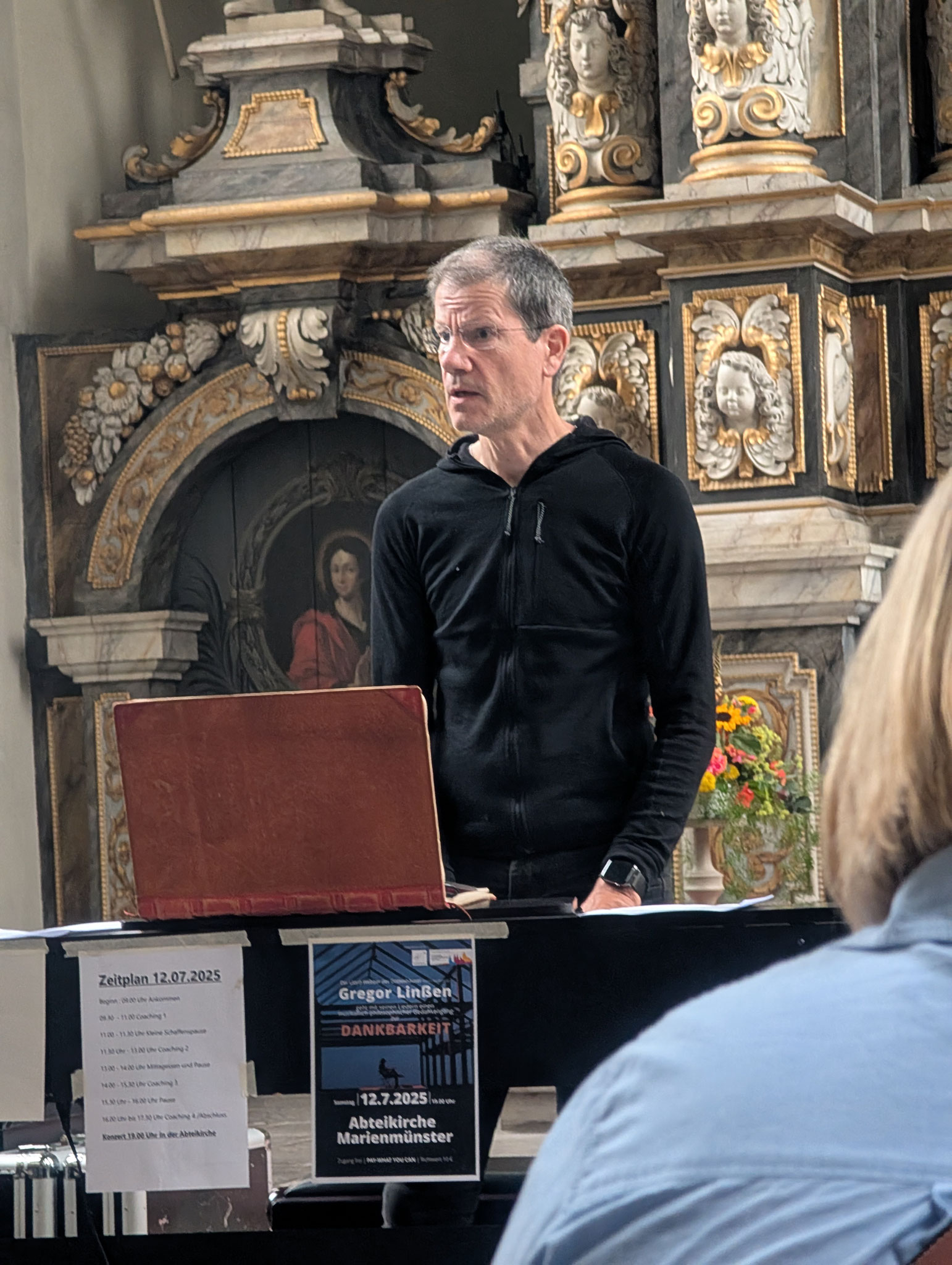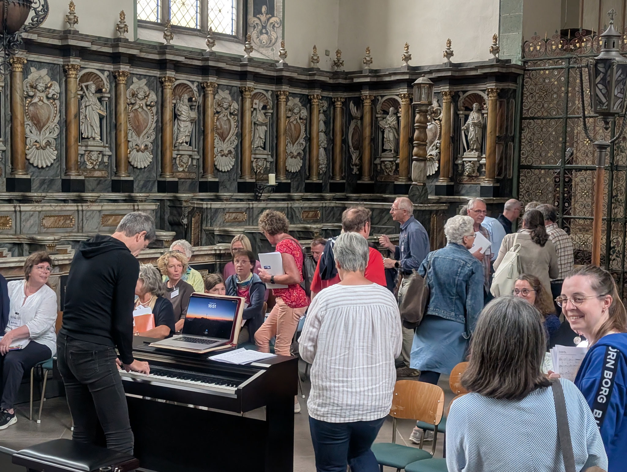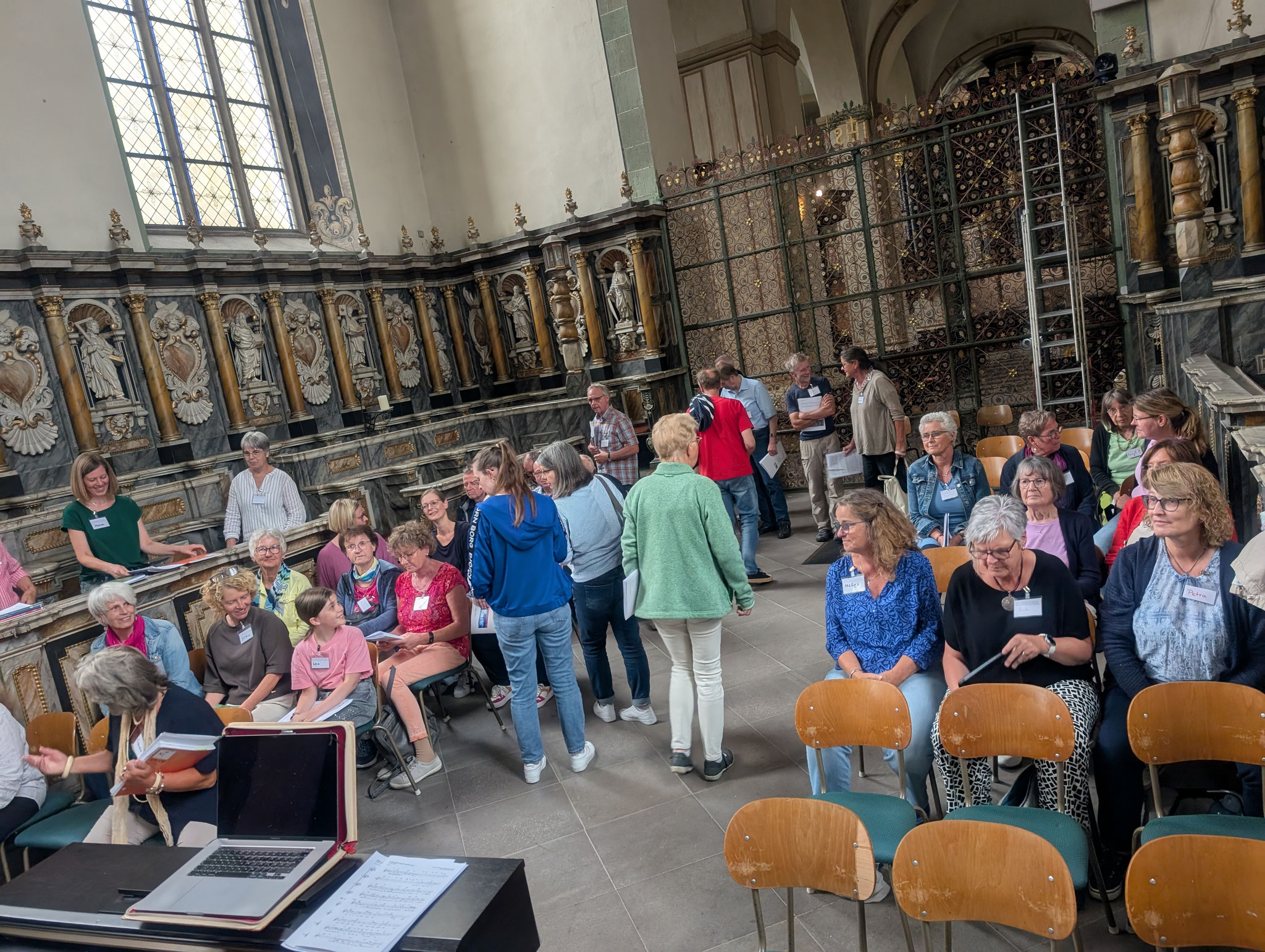 Von 9 bis 17 Uhr nahmen Sängerinnen und Sänger aus der Region an einem intensiven Musiktag im Pfarrsaal der Abtei teil. Ein zentraler Bestandteil war das Chorcoaching mit Gregor Linßen, der mit